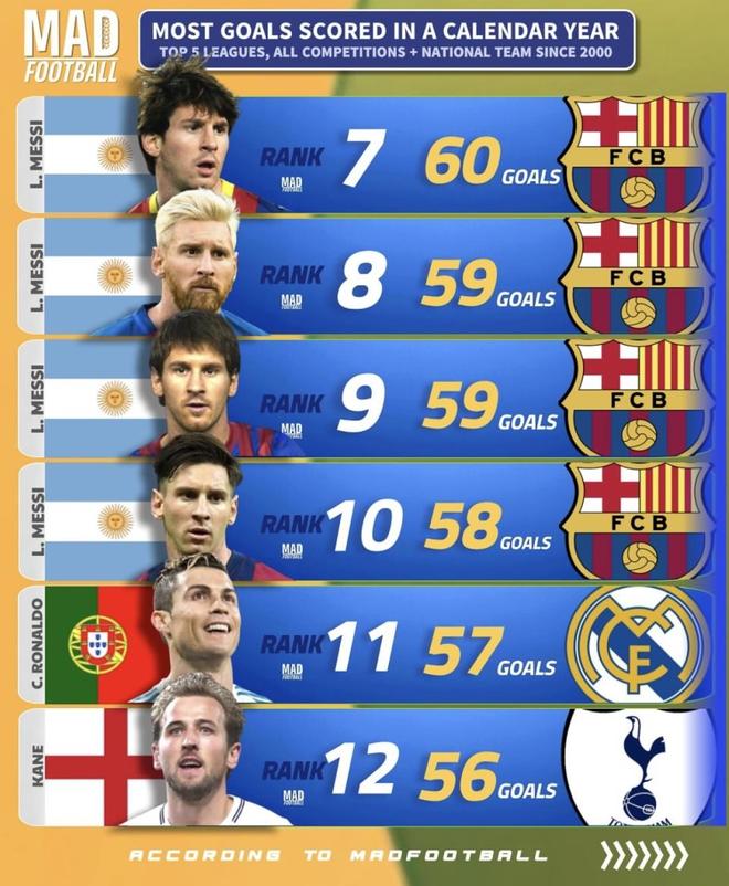 梅西91球神跡至今無人破!自然年進球排名:前六名中C羅出現(xiàn)四次