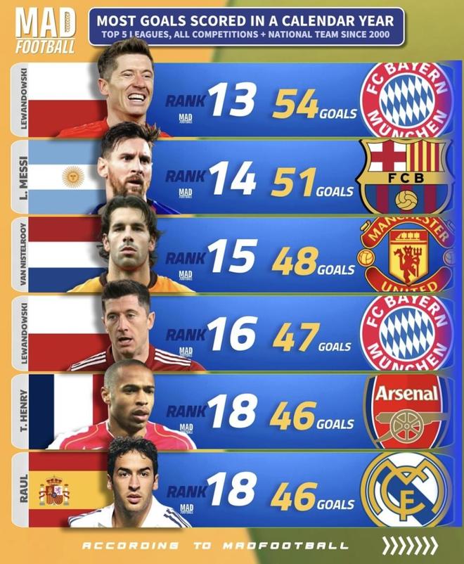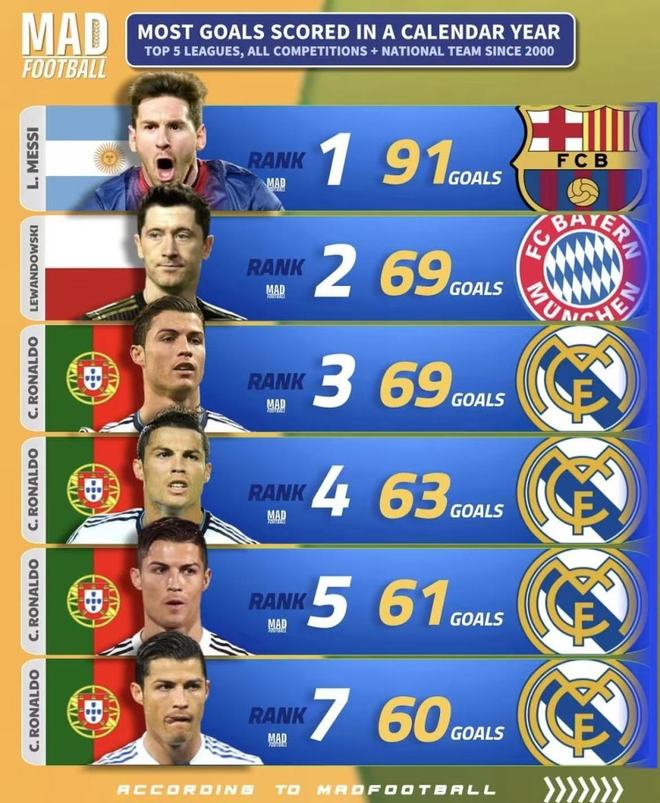 近日,MAD FOOTBALL 發(fā)布了“自2000年以來單個自然年進球紀錄”。數(shù)據(jù)最搶眼的是:梅西2012年91球高掛天花板,C羅2013年與萊萬2021年各69球緊隨其后;更關鍵的是出現(xiàn)次數(shù)與均值——18條入圍記錄里,梅西上榜6次(場均63球)、C羅5次(場均62球)、萊萬3次(場均56.7球)。這不是某一年的爆表,而是誰能把高產變成習慣。(數(shù)據(jù)截至北京時間2025年9月20日)